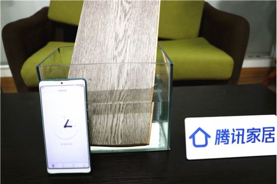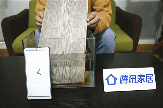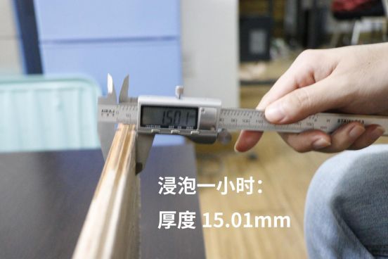 測小組決定采用最直接、最殘酷的“泡水實驗”。在下午3點05分,將切割後的地板直接泡進玻璃水缸中,並在一小時後取出,進行地板厚度數據的測量,用直觀的數據展示泡水一小時後的變化。