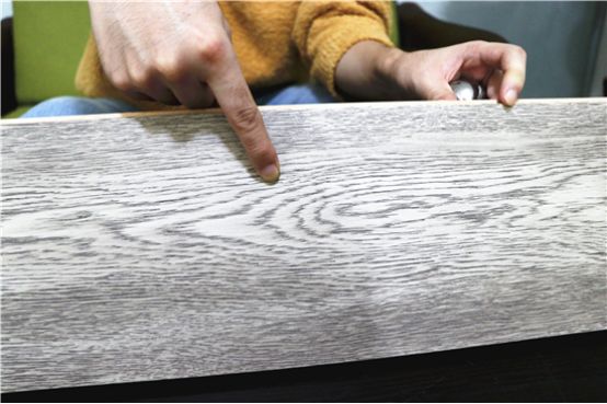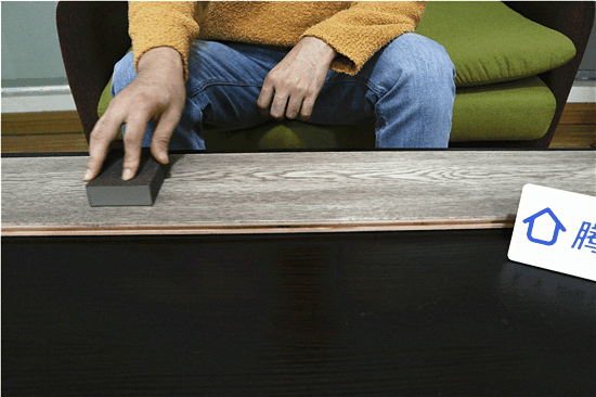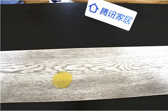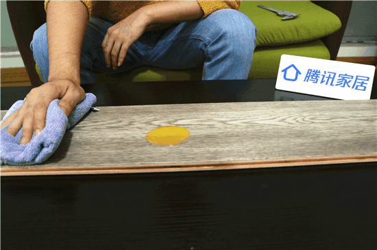 地板鋪設在大廳、房間中,難免會遇到調味品、飲料打翻或小孩子塗抹亂畫的情況,所以地板是否耐髒十分重要。評測人員將濃稠的鮮榨果汁倒在地板表麵,模擬汙漬,靜待30分鍾後,用毛巾輕輕擦拭,可以看到地板表麵的果汁輕鬆被擦除,沒有留下一點汙漬,可見,本款地板的防汙性能非常突出,方便日常生活的打理。