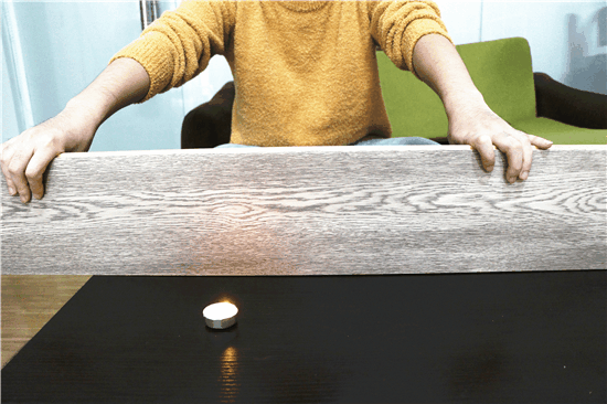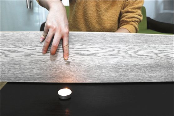 評測人員在現場點燃蠟燭,將火苗在地板表麵固定放置長達15秒鍾的時間,表麵產生了黑色熏烤痕跡,但是拿抹布就能輕鬆擦去黑色印記,並沒有產生任何損壞,現場也無刺鼻異味的產生。用手觸摸地板表麵,這麽長時間與火焰接觸下,並沒有產生溫度變化。這說明這款地板產品的耐高溫阻燃性能比較出色。縱橫交錯的組織結構使地板耐地熱,不易受到濕度和溫度的影響,是安裝地暖的最好地板。