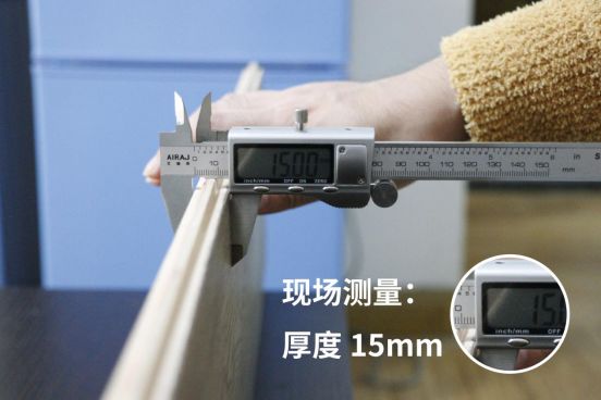 下午4點05分,將浸泡一小時後的地板取出,外觀無明顯變化,小編用遊標卡尺進行厚度的精準測量,可以看到浸泡一小時後,整體的厚度上是15.01mm(毫米)與初始的厚度15.00mm(毫米),僅有0.01mm(毫米)的變化。可見,本款地板在防水穩定性上十分出眾,不用太擔心地板受潮變形,足以應對生活中的突發情況。