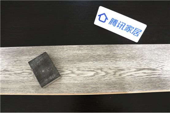 在地板長期的使用過程中,鞋子踩踏和家具的拖拽會造成地板表麵漆膜脫落或者凹凸不平的表麵也會嚴重影響家庭環境的美觀度。因此,衡量地板是否耐磨抗刮,地板的漆麵工藝是必須要關注的。為測試這款地板的耐磨性,小編動用了破壞力極強的金鋼砂海綿來對其進行考核。